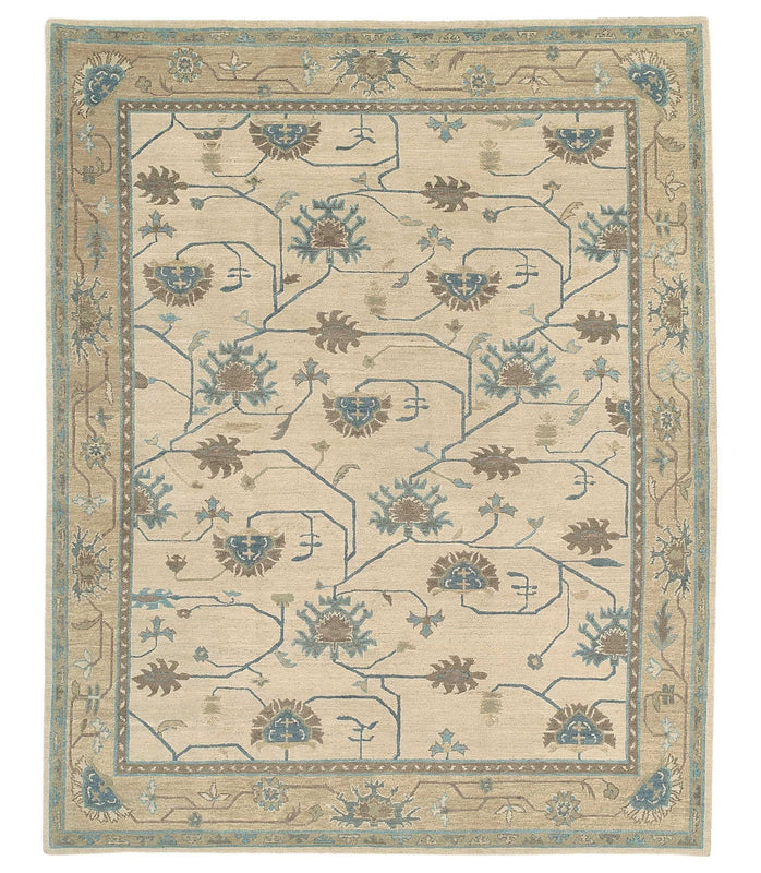 Lyrical vines and artfully detailed flowers are framed like a window to the most exotic garden. An Eastern aesthetic infuses this hand knotted Himalayan wool rug with muted tones of blue and green over a light beige field and taupe border.