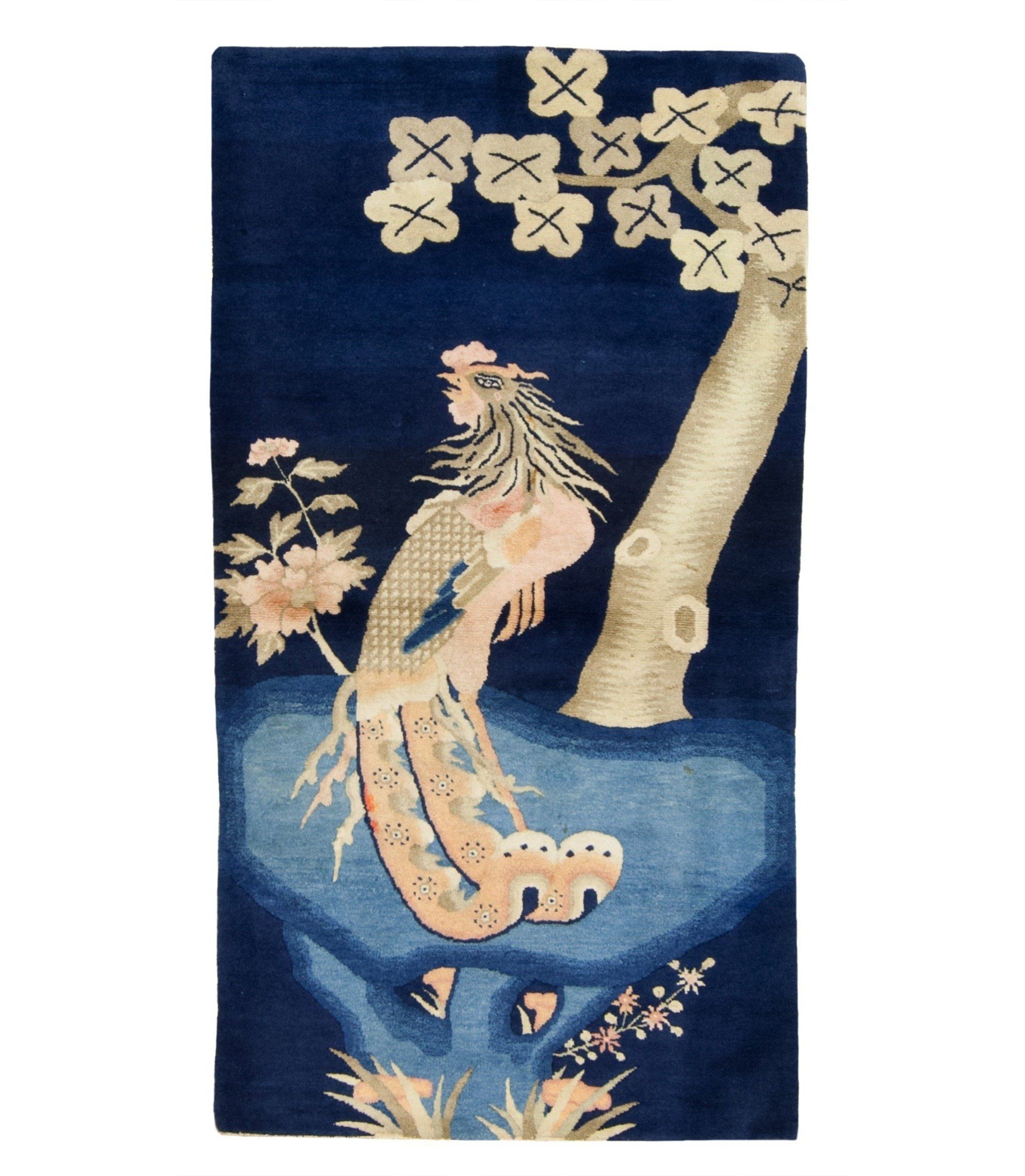 This exquisite ANTIQUE CHINESE PAO TAO DO rug exudes luxurious nobility, with its breathtaking 100% wool design in regal blue and ivory. Its intricate and finely woven pastoral pattern adds to its timeless, classic elegance, and features a beautifully rendered phoenix, the classic Chinese symbol of luck. An exquisite antique area rug that is sure to captivate and inspire the beholder.