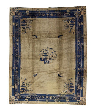 This exquisite 100% wool antique Chinese Peking area rug features a beige field complemented by a deep indigo border, a traditional central medallion, and floral accents. Hand-crafted with sophistication and elegance, this stylish 9' 1 1/2" X 11' 3 1/2" rug is the perfect finishing touch for any sophisticated home.