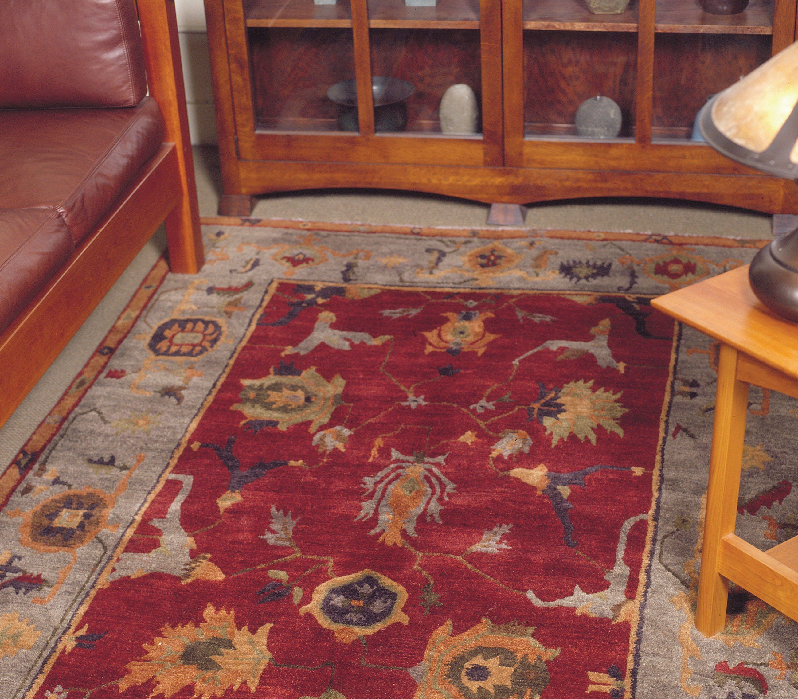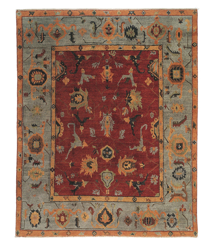 Whimsical motifs are grounded in traditional folk design and a complimentary border field. A cozy Arts and Crafts rug with a touch of the exotic. A brilliant brick red field is accented in lovely orange, green and steel blue.