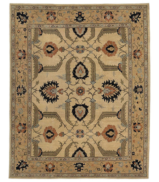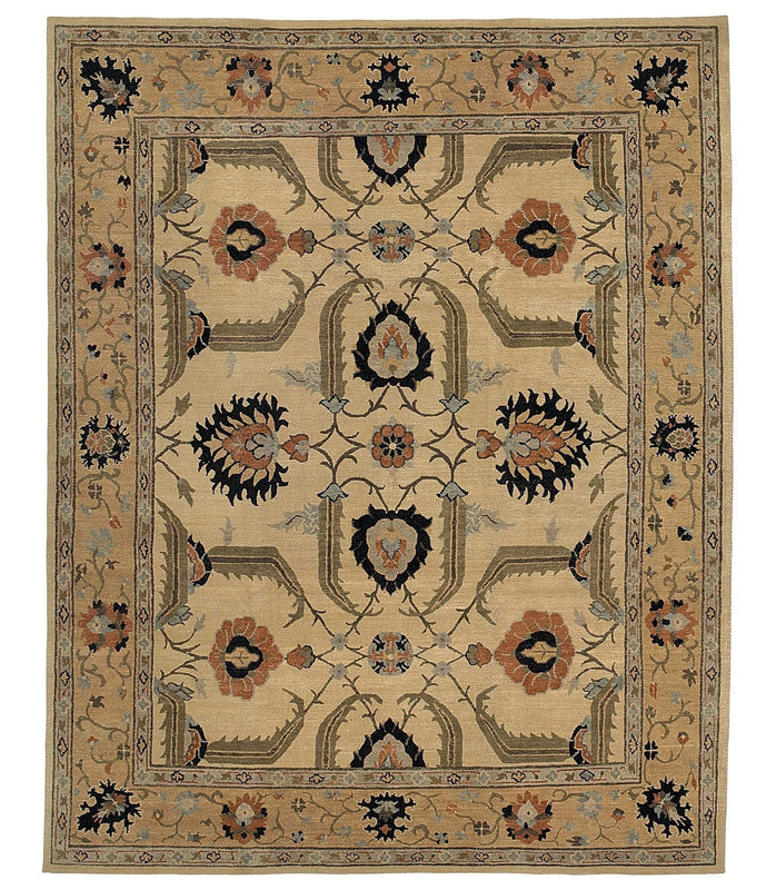Charming arts and crafts border rug. Delicate detailing elevated through artisan handcrafting and lush Himalayan wool. Kilkenny Almond has a beautiful contrast of black and orange tones over a light yellow beige field.