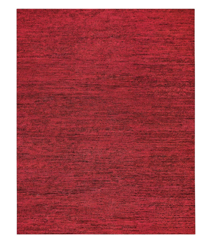 A blend of wool and hemp pile creates a textural statement; carved through thick pile in a series of hidden passageways, a modern design that will transcend time. A colorway to spice up the floors, a modern and transitional color marriage of bold red peppered with black. This rug works well in mid century modern settings.