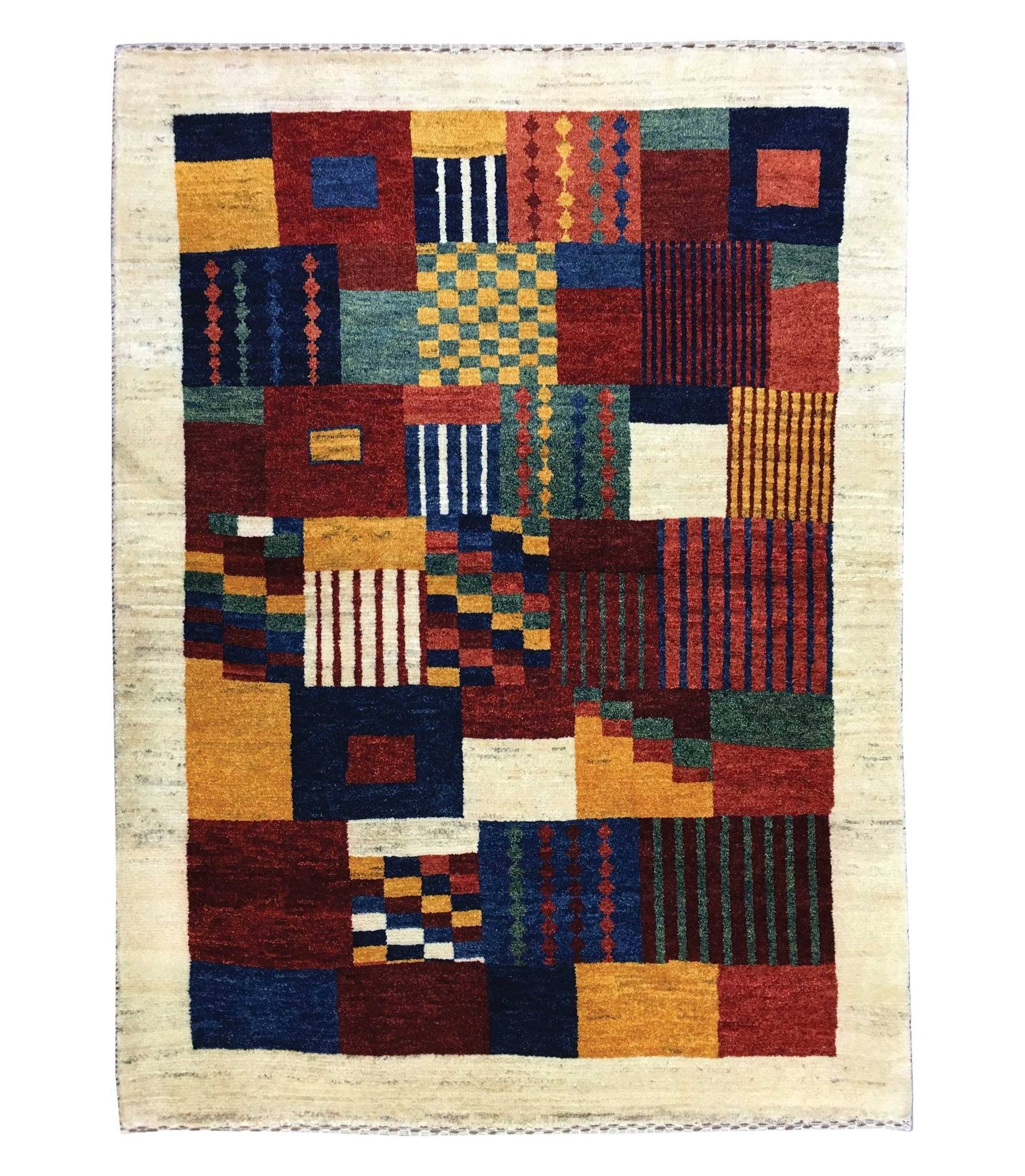 This one-of-a-kind Persian gabbeh was hand knotted using 100% Persian wool.