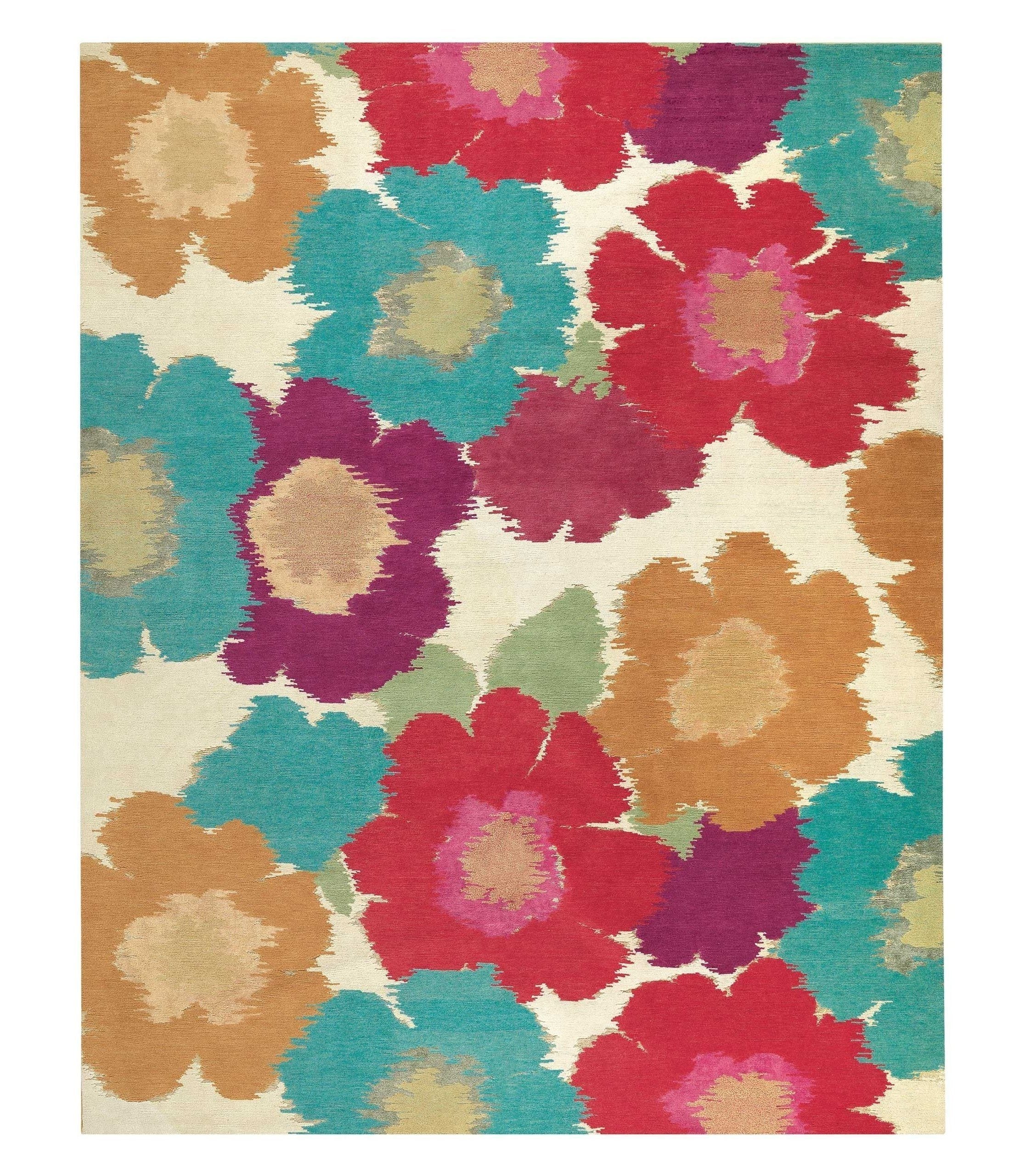 A colorful Tibetan rug with a white field and bright flowers. Experience each day with the grace and serenity of beautiful garden paths filled with fresh blossoms. An expert blend of bright colors against a white background, Posies White provides a perfect accent to add color and life to any space. Made in Nepal of wool and linen, this rug was woven using our Timpa weave, giving the rug an average pile height a little shorter than half an inch.
