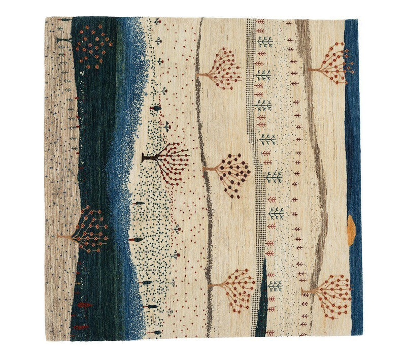 A one-of-a-kind tribal design, this Persian gabbeh Tajik was hand knotted using 100% Persian wool. It measures 4' 9" x 4' 10"