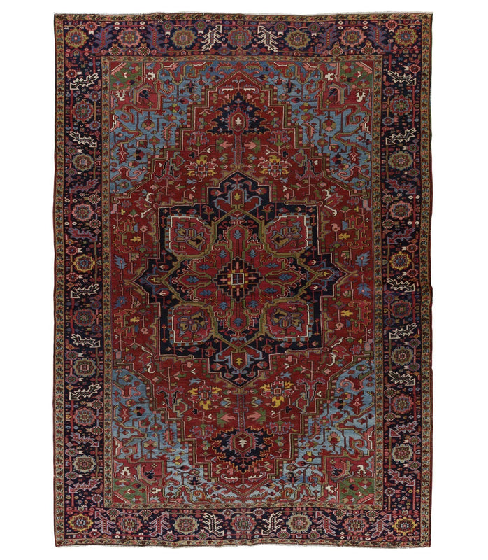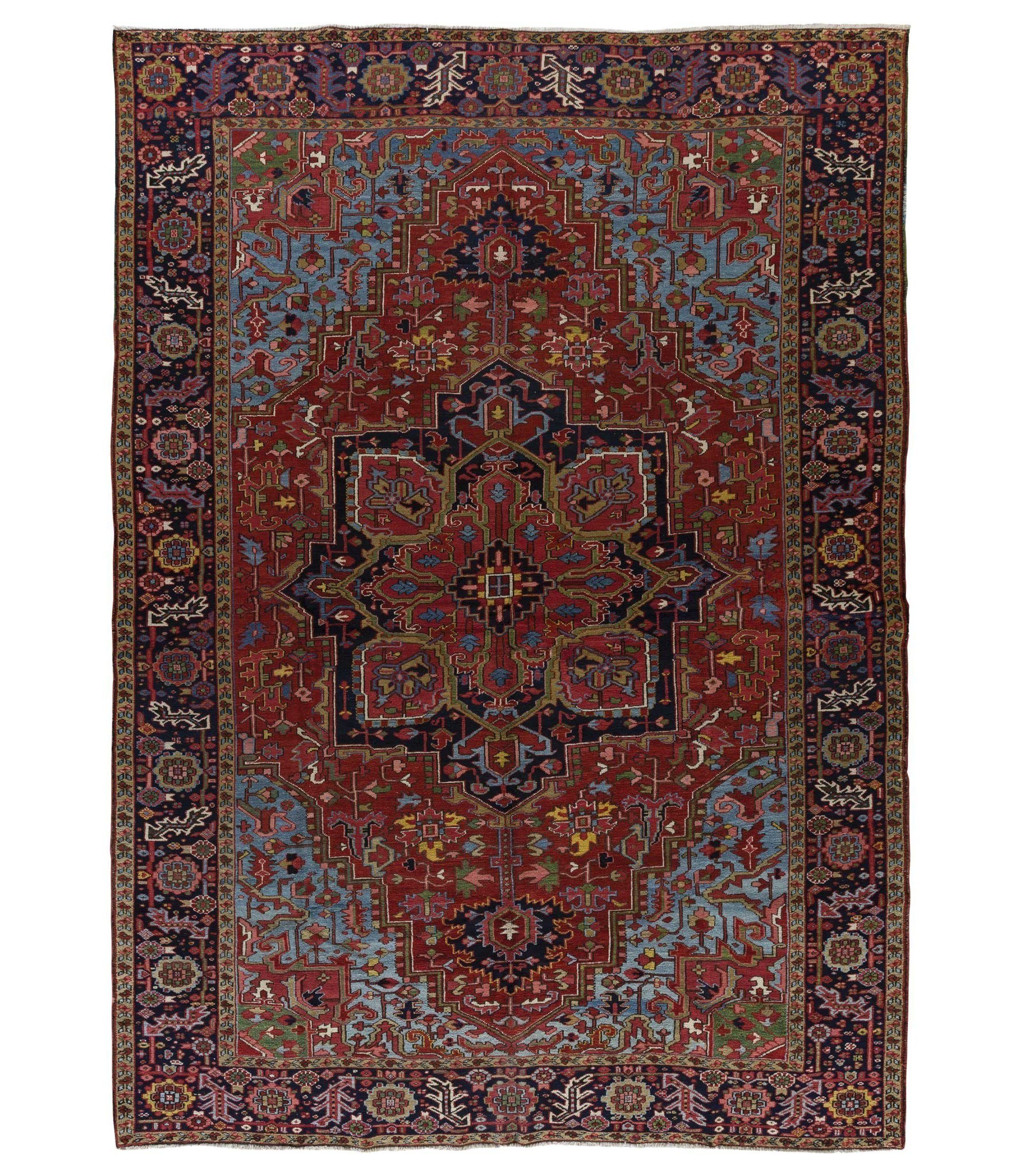 This antique rug measures 9'2" x 12'10". It was hand selected by James Tufenkian for its unique color palette, vibrant yarns and excellent condition. This one-of-a-kind carpet is available for immediate delivery from our US warehouse.