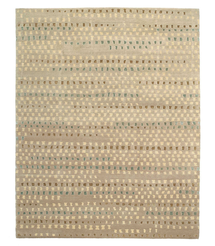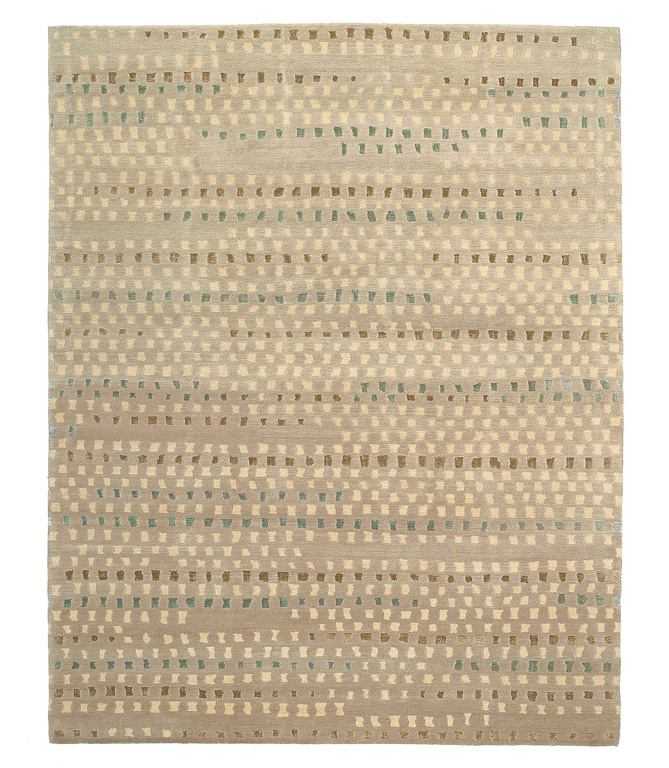 Create a pebble effect on your floors with the Soft Spot Sandbar. A handcrafted area rug made in Nepal using the finest wool and silk and woven with our Shakti quality weave. This Soft Spot Sandbar rug has pile height of 0.28 inches with a pattern of uncut loop pile which create an elegant and textured carpet. Uneven stippling, and complimentary palates create a comforting hum in this wool and silk carpet. The Soft Spot Sandbar has a sandy beige wool field with textured windows of light olive green and caramel silk and uncut wool loop pile in a light golden beige. A grounding design to pull in multiple colors in your decor and bring together different accents in your space.