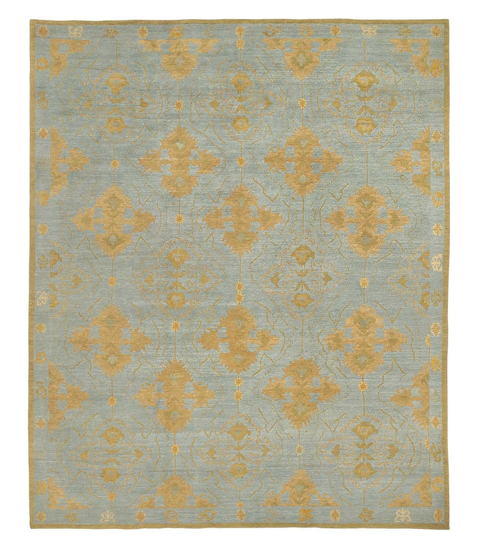 Ethnic medallions grace this design in a repeating pattern, highlighted in sophisticated colorways. Samkara is bold and fresh, an exotic arts and crafts backdrop for any room. This rug was hand-knotted using our Kotana weave which delivers maximum texture and fine detail with an average pile height of 0.41 inches. Samkara Lac D'Or is light steel blue with accents in beige and gold.