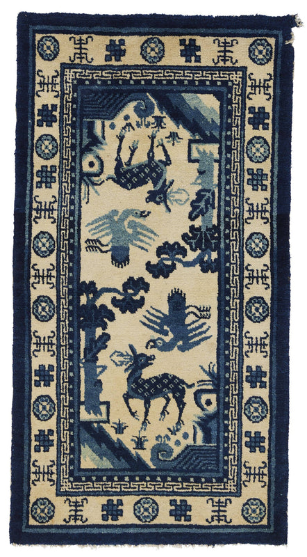 This one-of-a-kind ANTIQUE 2'2" X 4' 2 1/2" is hand-woven of 100% wool in China over 100 years ago. It has a patterned border with deer and birds in the field, in blues and ivory. Its excellent quality and great condition make it a timeless piece of craftsmanship.