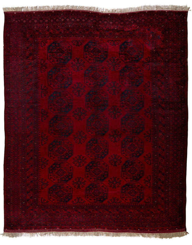 This is a hand knotted Antique Afghan Ersari, crafted sometime prior to the mid 20th century. It was made of 100% wool in Afghanistan. This traditional rug features a repeating octagonal motif in navy blue against a deep red background. This one-of-a-kind piece was hand selected by James and is available for immediate delivery.