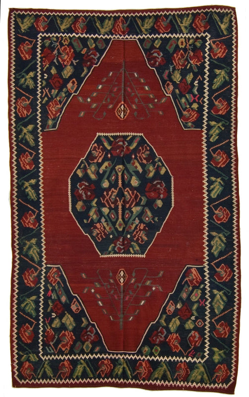 An antique Armenian flatweave carpet, hand knotted using vegetable-dyed wool. This piece measures 4'3 x 6'11" and is in excellent condition.