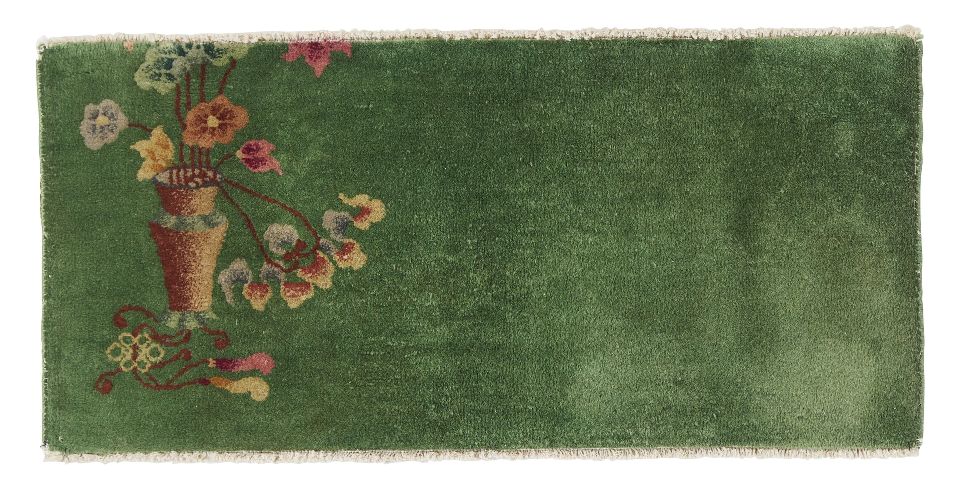 This one-of-a-kind ANTIQUE CHINESE NICHOLS GREEN 1'5" x 2'11" is hand-woven of 100% wool in China over 100 years ago. It has a beautifully simple green rug with intricately woven flowers in pinks, orange, yellow, green and blue . Its excellent quality and great condition make it a timeless piece of craftsmanship.