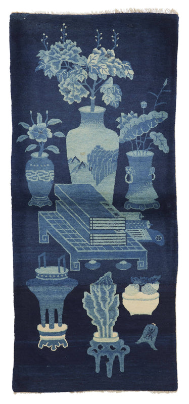 This one-of-a-kind ANTIQUE CHINESE PAO TAO 2'6" x 5'8" is hand-woven of 100% wool in China over 100 years ago. It has unique still life imagery in blues and cream. Its excellent quality and great condition make it a timeless piece of craftsmanship.