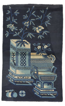 This one-of-a-kind ANTIQUE CHINESE PAO TAO BLUE 3'1" x 4'11" is hand-woven of 100% wool in China over 100 years ago. It has unique still life imagery in blues and cream. Its excellent quality and great condition make it a timeless piece of craftsmanship.