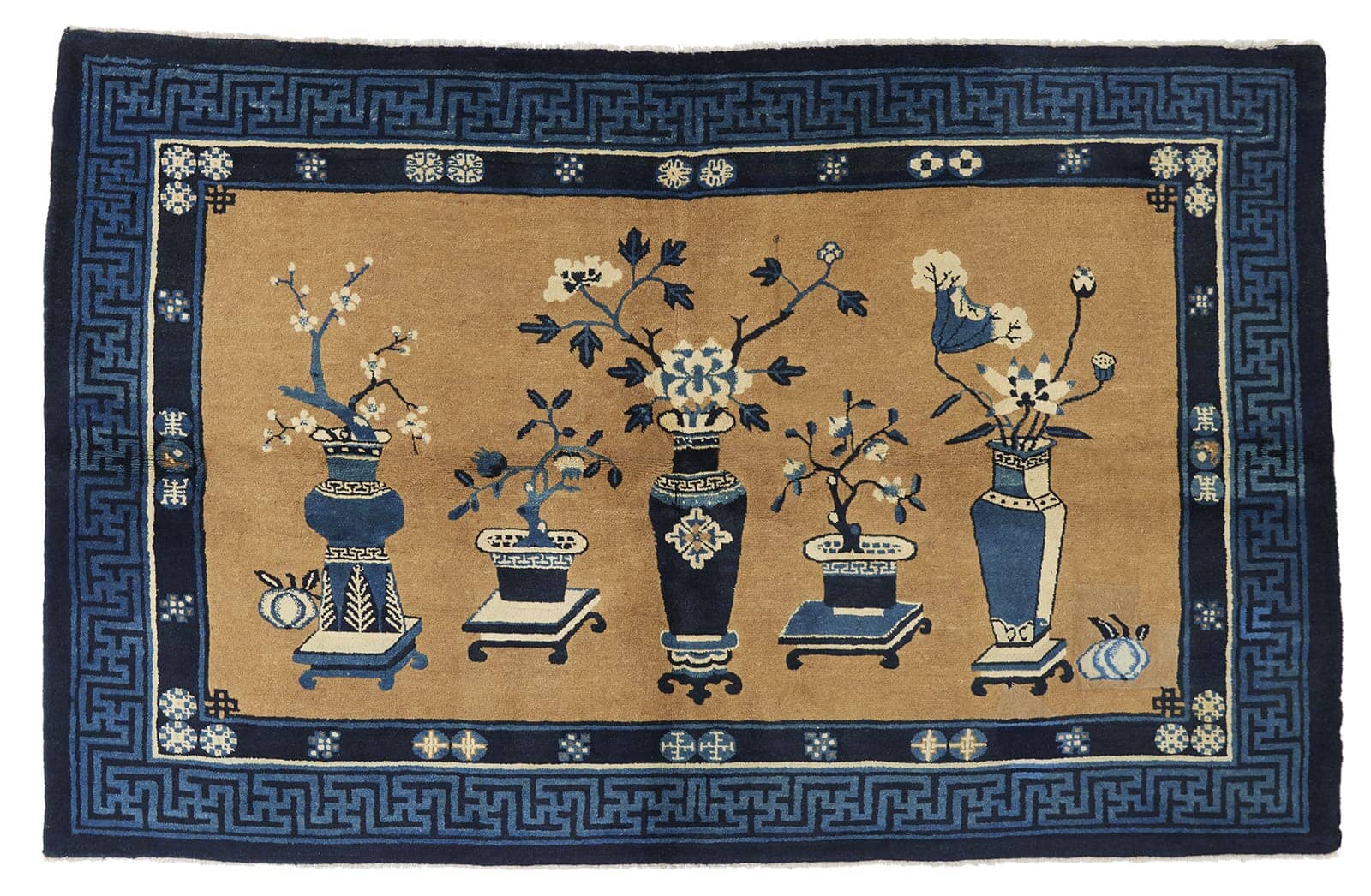 This is a hand knotted ANTIQUE CHINESE PAO TAO DO, BEIGE/BLUE - IMAGE rug, crafted sometime prior to the early 20th century and measuring 4'6" x 7'1". Made in China of 100% wool, this traditional rug depicts a scene with vases and flowers, rendered in exquisite blues, beiges, and browns. This piece was hand selected by James and is available for immediate delivery.