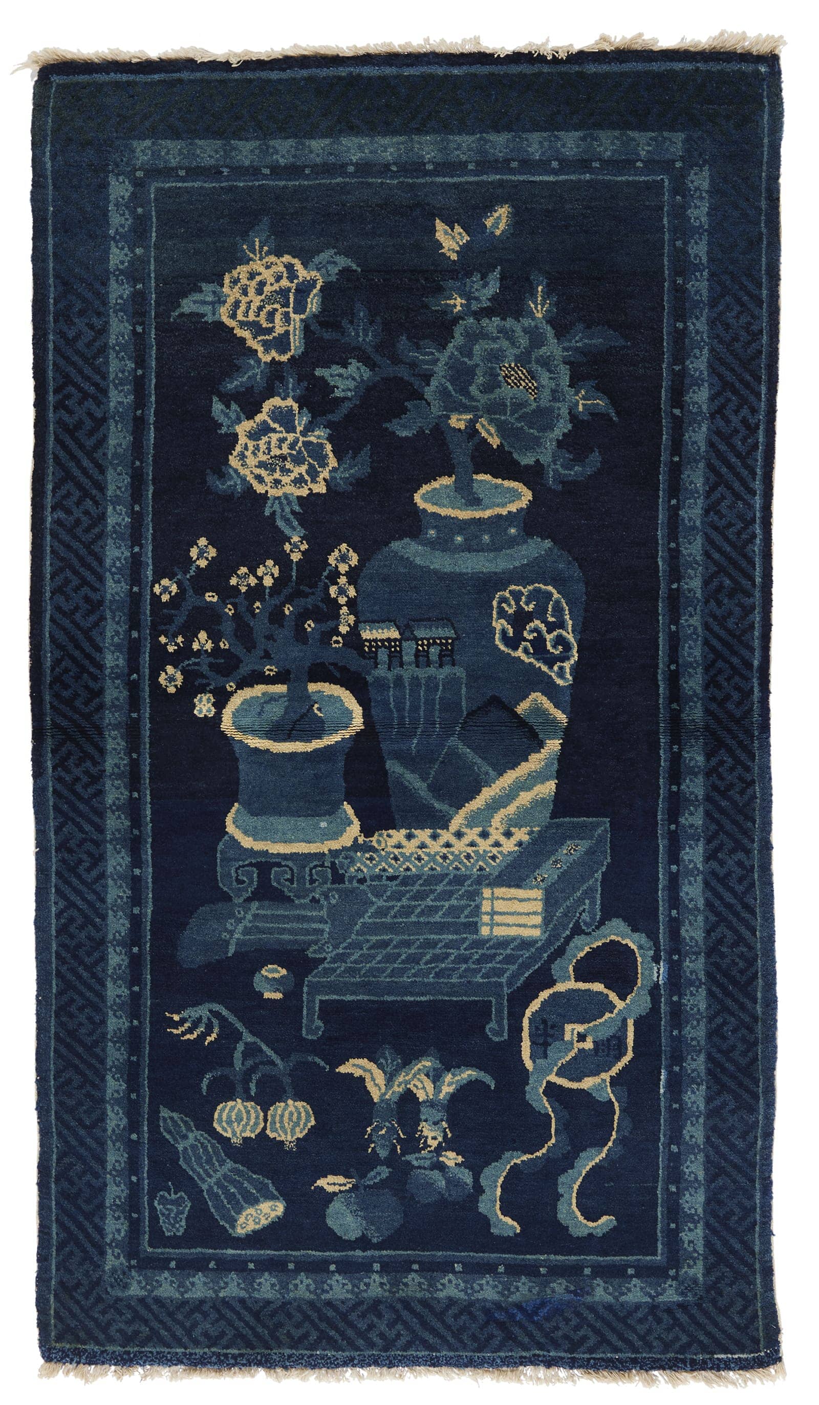 This is a hand knotted ANTIQUE CHINESE PAO TAO DO, BLUE/BEIGE - IMAGE rug, crafted sometime prior to the early 20th century and measuring 2'7" x 4'4". Made in China of 100% wool, this traditional rug depicts a scene with vases and flowers, rendered in exquisite blues and beiges. This piece was hand selected by James and is available for immediate delivery.