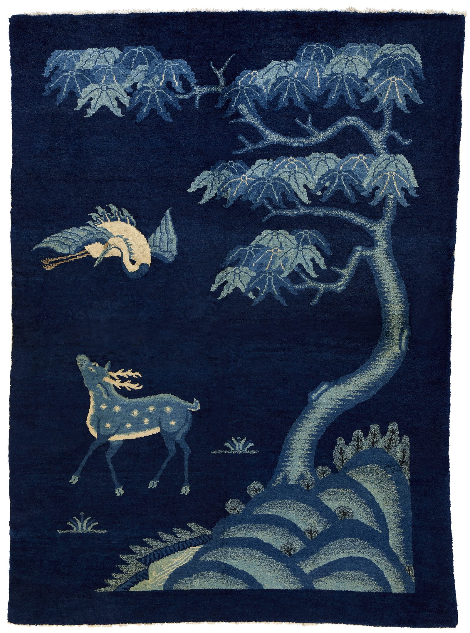 ANTIQUE CHINESE PAO TAO DO, BLUE - DEER AND CRANE 4' 4'' x 5' 9''