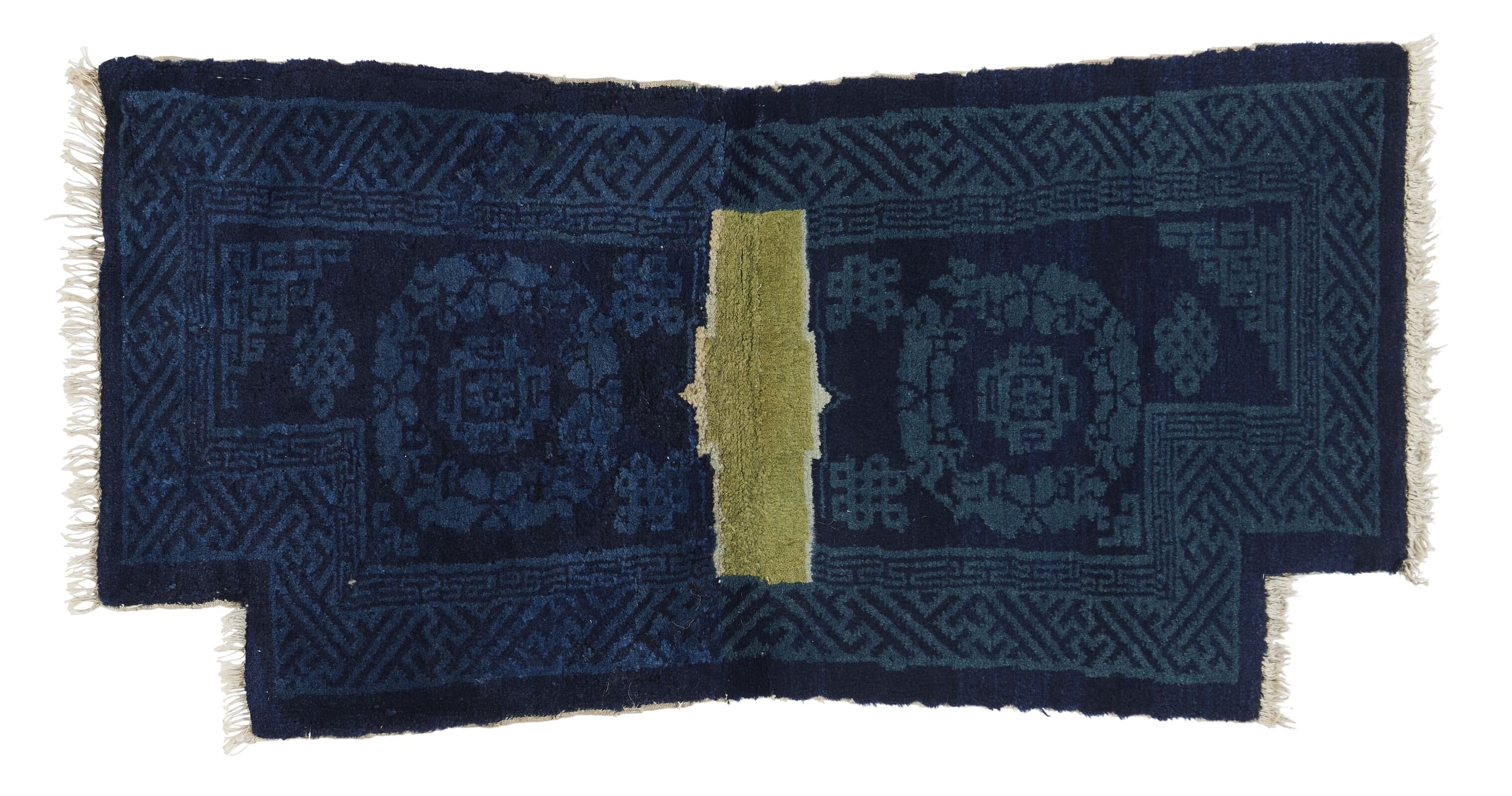 This one-of-a-kind ANTIQUE CHINESE PAO TAO DO BLUE SADDLECLOTH 1'9" x 3'6" is hand-woven of 100% wool in China over 100 years ago. It has ornate trellis patterns woven in dark blues and green. Its excellent quality and great condition make it a timeless piece of craftsmanship.
