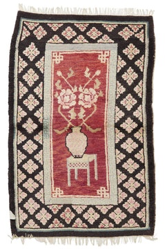 This is a hand knotted ANTIQUE CHINESE PAO TAO DO, RED/BROWN rug, crafted sometime prior to the early 20th century and measuring 3'4" x 5'1". Made in China of 100% wool, this bordered rug depicts a central scene with a traditional vase and flowers, rendered in brown, beige, red, and pink hues. This piece was hand selected by James and is available for immediate delivery.