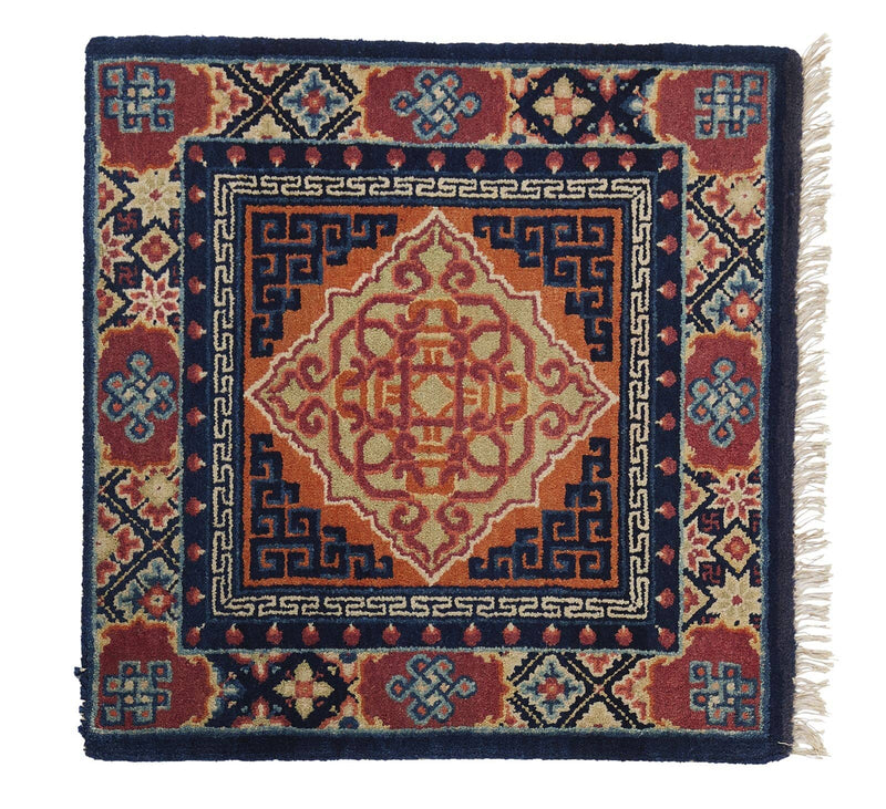 This one-of-a-kind ANTIQUE CHINESE PAO TAO DO TEMPLE SEAT 2'2" x 2'2" is hand-woven of 100% wool in China over 100 years ago. It is a beautiful ornate temple seat, in a multicolor palette of in blues, orange, reds, and beige. Its excellent quality and great condition make it a timeless piece of craftsmanship.