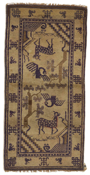This Pao Tao Gold-Plum rug is part of pair, hand woven of 100% wool in China. This rug was personally selected and imported by James Tufenkian, chosen for the combination of excellent quality and great care.