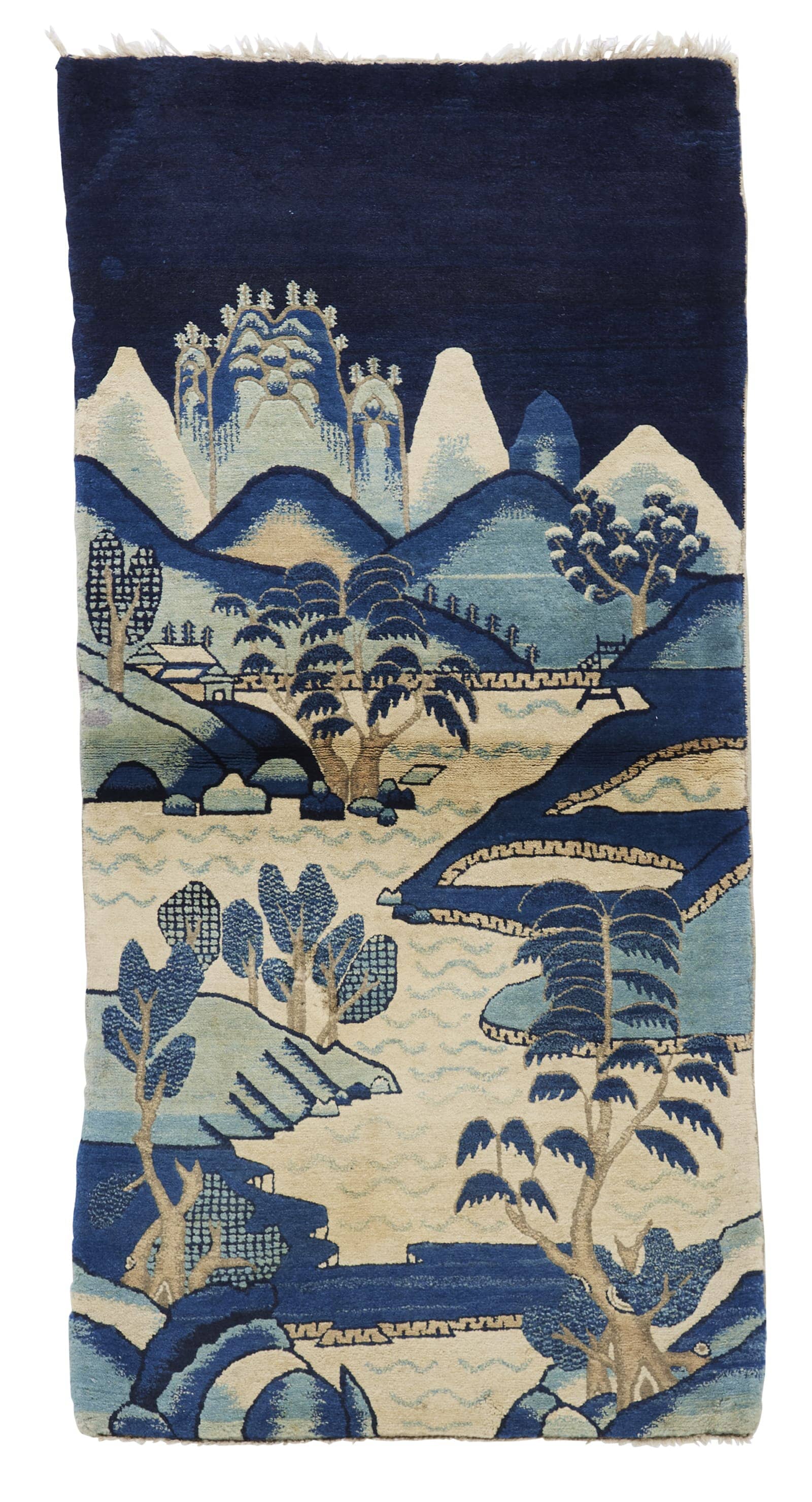 This one-of-a-kind ANTIQUE CHINESE PAO TAO, LANDSCAPE 2' 7'' x 5' 3'' is hand-woven of 100% wool in China over 100 years ago. It has a beautifully indigo blue background and beautiful pastoral scene, in a palette of beige and blue. Its excellent quality and great condition make it a timeless piece of craftsmanship.