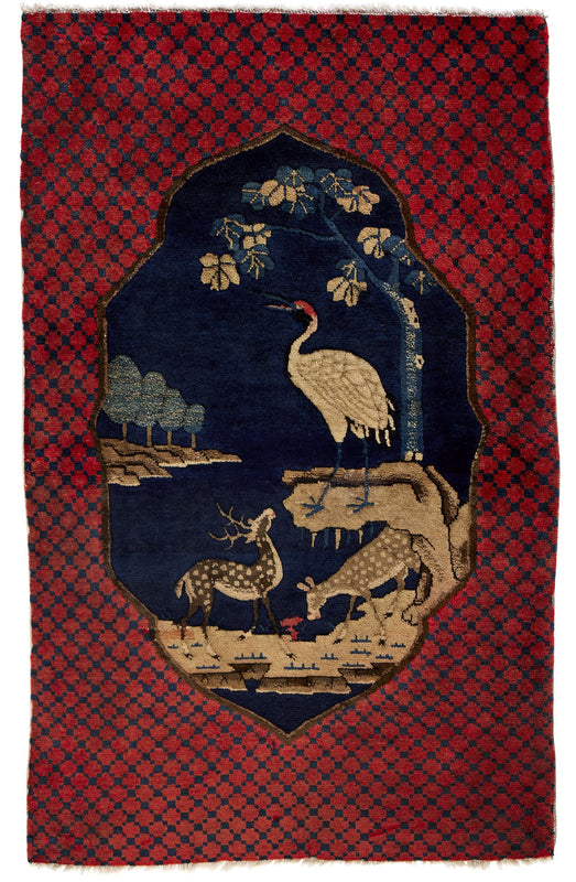 This one-of-a-kind ANTIQUE CHINESE PAO TAO DO was hand-woven of 100% wool in China over 100 years ago. It has a large, ornate patterned border and a beautiful pastoral scene featuring small deer and a graceful crane. This unique rug was woven by hand using shades of indigo, creamy beige and deep red. Its excellent quality and great condition make it a timeless piece of craftsmanship.
