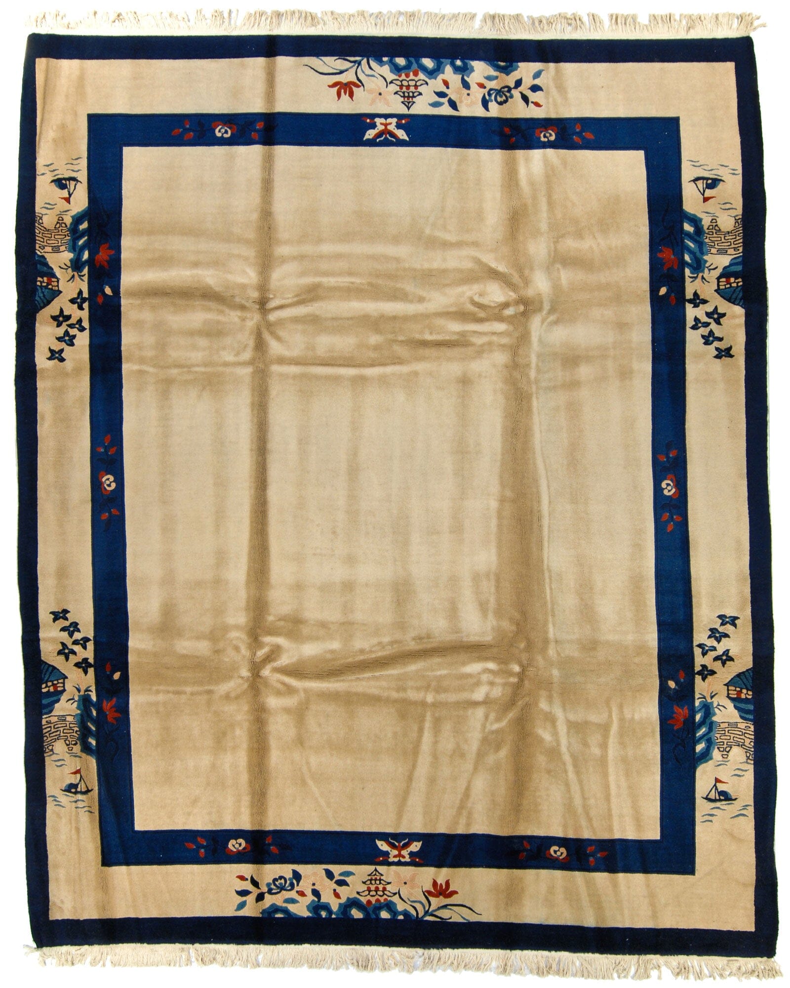 This Chinese carpet is a lovely reproduction of an antique Peking design. It measures 8'4" x 10'2", and was hand knotted from 100% wool in China. The background is a light beige, with a blue border and an art deco inspired floral pattern. This rug is an incredible value and once it sells, it's gone forever!