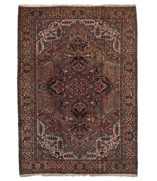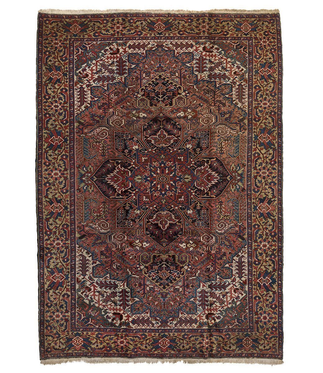This antique carpet was knotted by hand in Iran prior to 1949. It features exquisite detail and the finest of knotting. Made of 100% Persian wool, this Heriz rug is in excellent condition. This carpet measures 8' 2" X 11' 6".