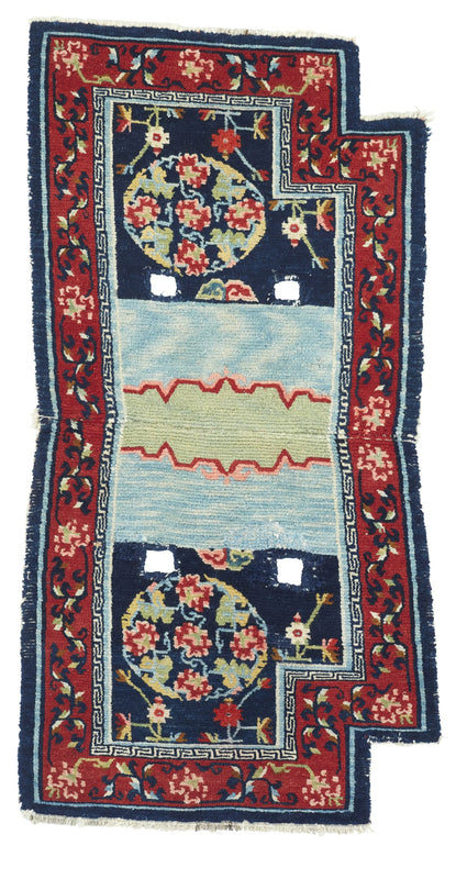 Experience luxury and history with our Antique Tibetan saddle blanket. Hand-knotted in Nepal, this exquisite 100% wool piece showcases intricate craftsmanship and cultural significance. Perfect for adding a touch of elegance to a cozy nook.