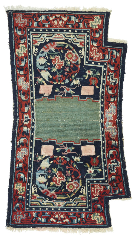 Indulge in the luxury of an antique Tibetan horse saddle. This 19th-century masterpiece features exquisite floral and medallion designs, bordered by a tranquil tidal wave motif. Hand-knotted in Tibet with 100% wool, this saddle is in good condition. Enhance your space with the artful essence of this rare and unique piece.