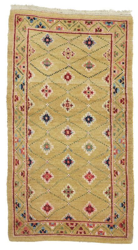 Featuring a delicate diamond pattern and a whimsical collection of flower motifs, this ANTIQUE TIBETAN TSENG-DHRUM exudes elegance and rarity. Handcrafted with 100% wool in Tibet, it boasts a rare color combination and is in good condition, making it a truly charming and exclusive piece for discerning collectors.