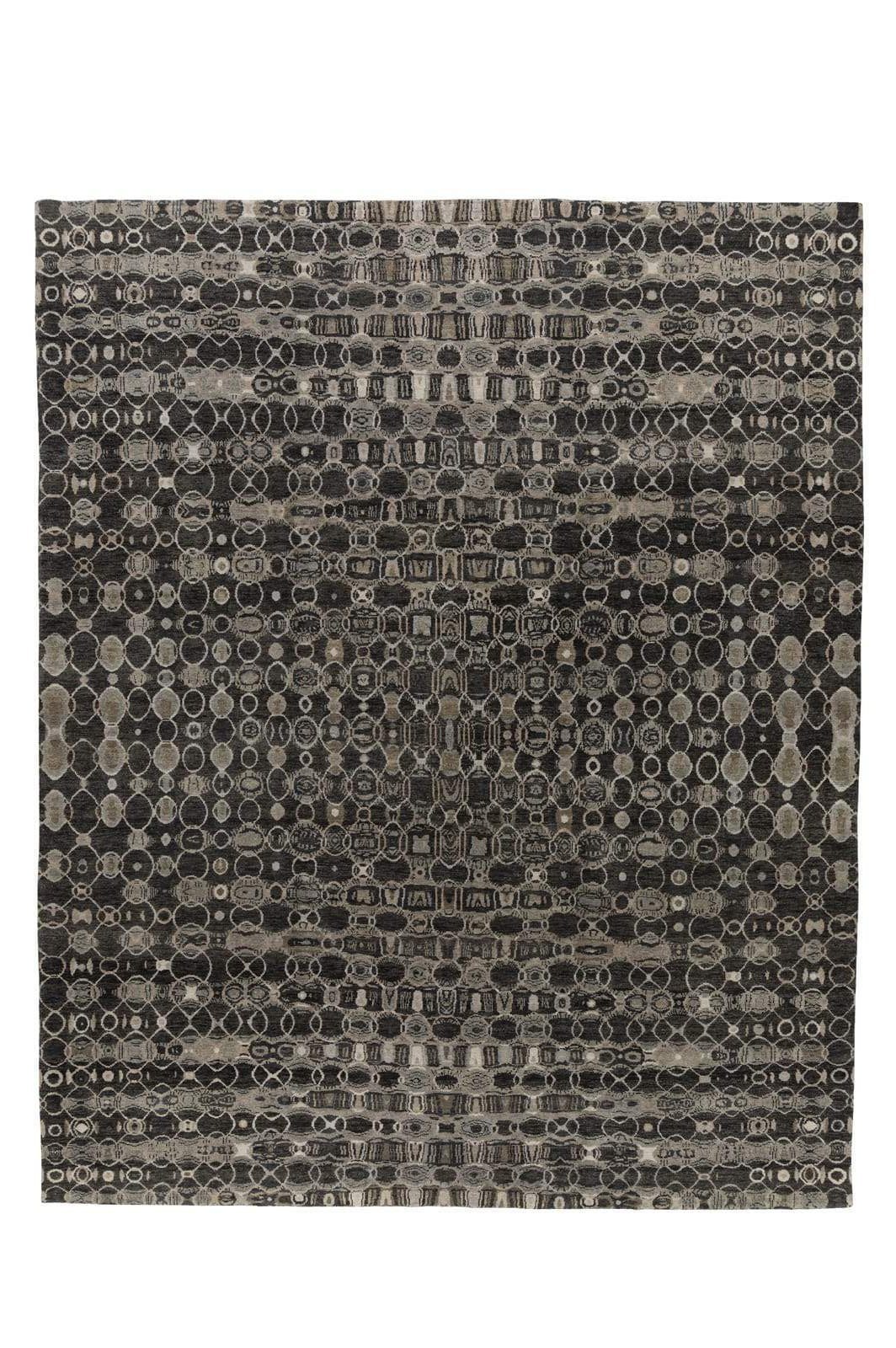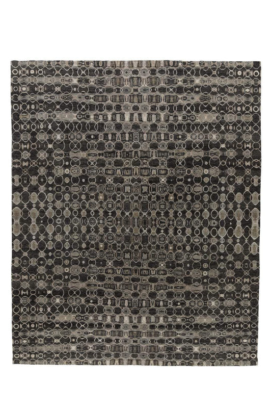 Prototype sample of Arpeggio Charcoal, black, bronze, greys, off white in a design that rises and descends in almost kaliedoscopic rhythm.