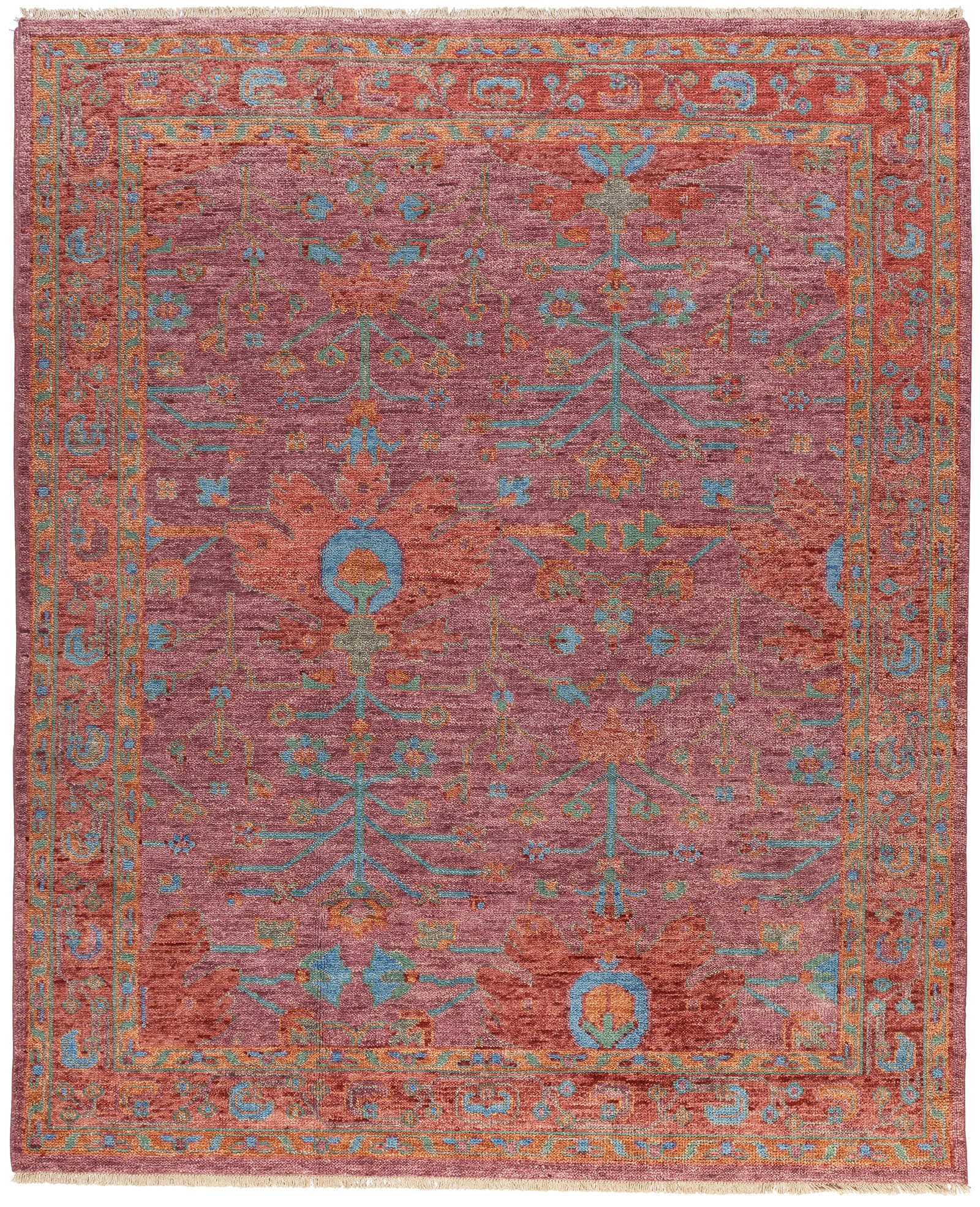 An unabashedly modern interpretation of familiar traditional designs made fresh and of this era through adroit, well composed, and somewhat unexpected youthful bohemian color palettes. With a refined balance of figurative drawing and classical elements accentuated by bold color, ROCK MY CLASSICS offers an invigorating aesthetic harmoniously suited to the contemporary maximalist. Eccentric uses of symmetry, delicately drawn motifs, and a patina echoing an aged heirloom pedigree are further enlivened via highly abashed color of delightful visual complexity. Hand knotted in India of 100% wool, the carpets of ROCK MY CLASSICS are informal and vibrant, a well-honed refresh at home among the finest furnishings.