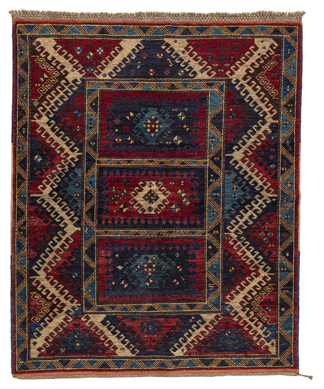 A tribal Armenian Kazak weave rug, the Bordjalu rugs feature a simpler design with particular use of latch hooks in large scale motifs. Bordjalu II 5x7 is a bold, archetypal design executed in madder red, deep navy blue, aqua, mushroom, and ivory. This rug is among the most distinctive Armenian carpet designs, incorporating deeply meaningful symbols into the bright and energetic palettes. This Bordjajlu rug is hand knotted of 100% Armenian wool on a wool foundation and adorned in wool fringe. Historically the Bordjalou rugs were woven in a district just south of Tiflis, an area known for producing the heaviest and most coarsely woven Kazaks. The Tufenkian Kazak rugs however all have a pile height around a third of an inch. This piece measures 5' x 7'.