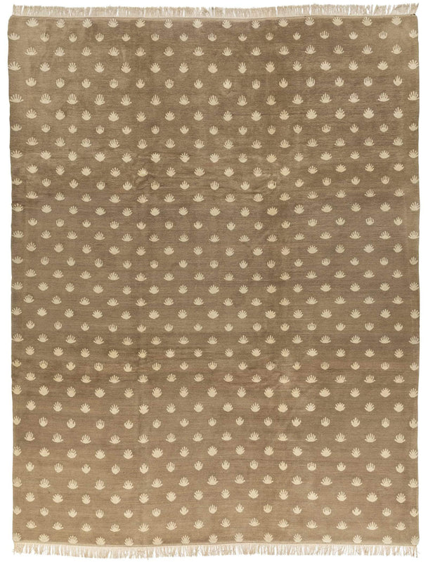 Brush sprouts was a classic Nepalese pattern from early 90's and this rug measures 8'9" x 11' 1" making it a short 9x12. This warm, wool field features a whimsical, dotted pattern of small sprouts.