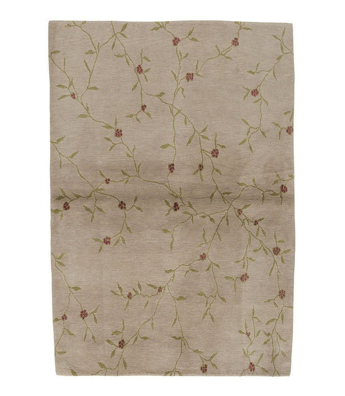Climbing Blossom Neutral is crossed by a pattern of gently shimmering silk vines and flowers. This one-of-a-kind rug was hand knotted using a combination of Tibetan wool and silk. The pile height is .28" and is only available as a 4' x 6'.