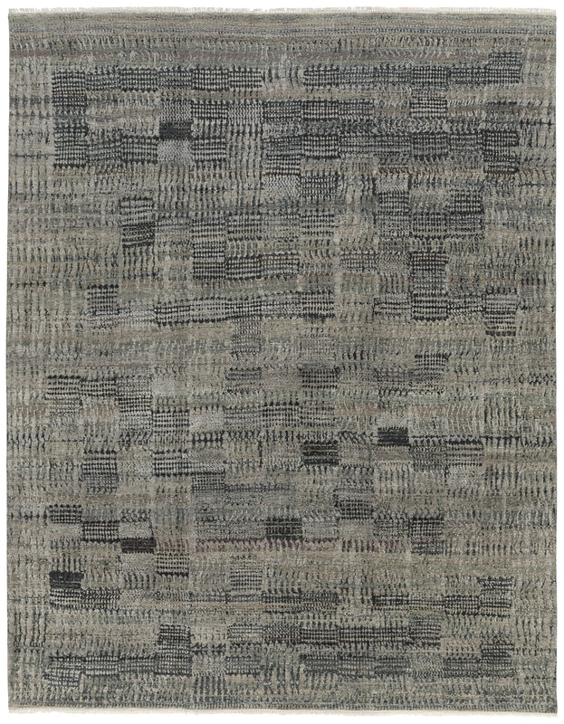 A rich and textural pattern of wool and silk with greys, charcoal, black and taupes, this rug measures 7'10" x 9'11" and was made as a one of a kind production sample in 2021.