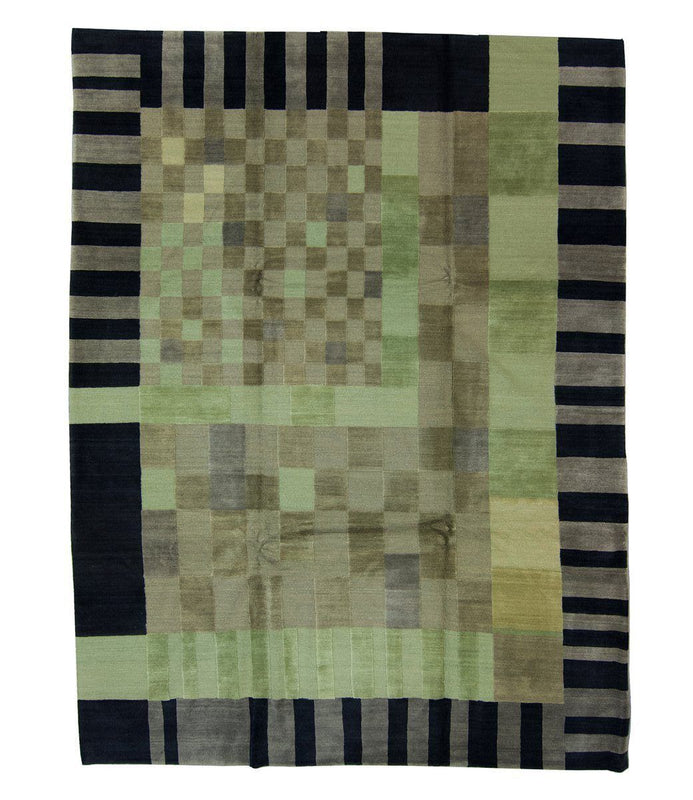 A modern, one-of-a-kind wool rug in green tones, Crossword is a modern area rug with a unique pattern displayed in a series of squares and rectangles evocative of an abstract crossword puzzle. This rug was hand-knotted in Nepal of Himalayan wool using our premium Shakti quality weave which has a pile height of about 0.28 inches and features a soft, luxurious finish. This particular color combination was only produced once, in the 9x12 size.
