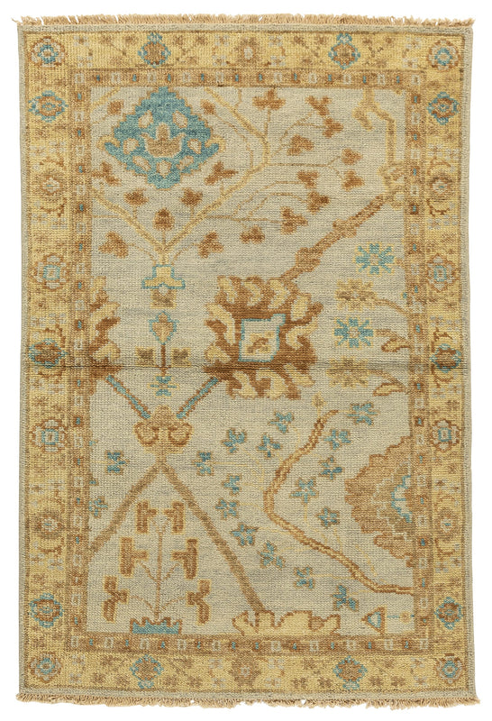 From our sample production we have an Arts and Crafts inspired design hand knotted in India with 100% wool featuring a background of grey blue, tans, golden brown, gold and teal. This piece is only available as a 4 x 6. Our rugs are normally available for delivery within 10 to 90 days.