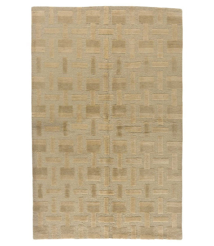 A modern Setana weave rug in beige. This DSN Lima piece is a one of a kind design which was handcrafted in Nepal as a prototype. It was made of 100% wool using our Setana quality construction with a pile height around 0.55 inches. The pattern is a beautiful cross stitch design. This carpet measures 6 x 9.