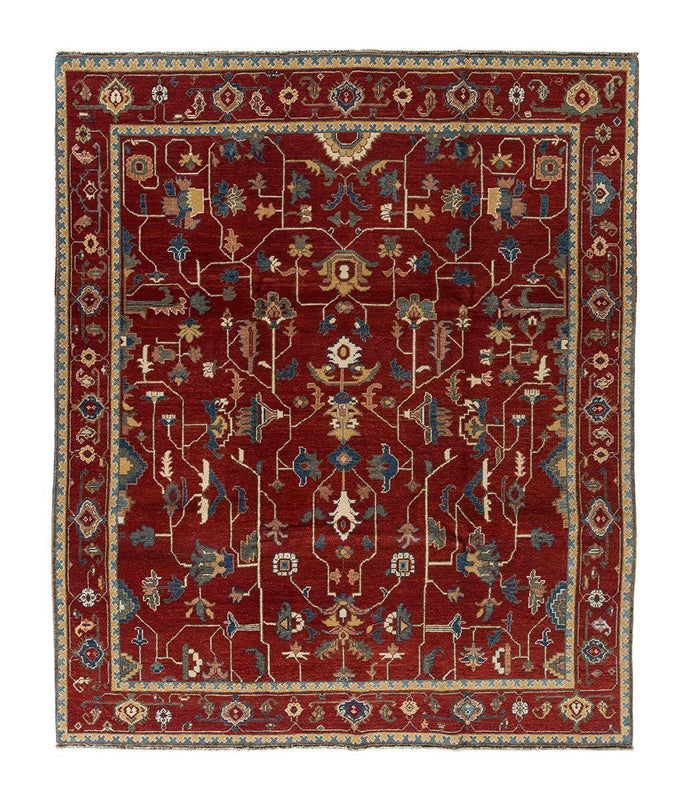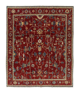 This one-of-a-kind Heriz-inspired design was crafted using 100% wool in Armenia.With a stylized take on the traditional Heriz motifs, this heirloom quality carpet is a perfect bridge between traditional and contemporary design. This rug measures approximately 8' x 10'.
