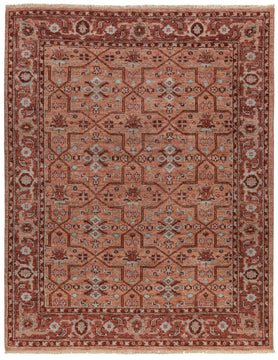 Heriz V Red is only available in this one 8x10 ft sample size and represents traditional elegance reinterpreted and luxury flooring that embodies modern heritage. An inspired red palette features a soft persimmon red, a dark rusty red, and gunmetal blue in an all over pattern in rich tones. Contact us or Request a Quote for timing on the rug and size of your choice.