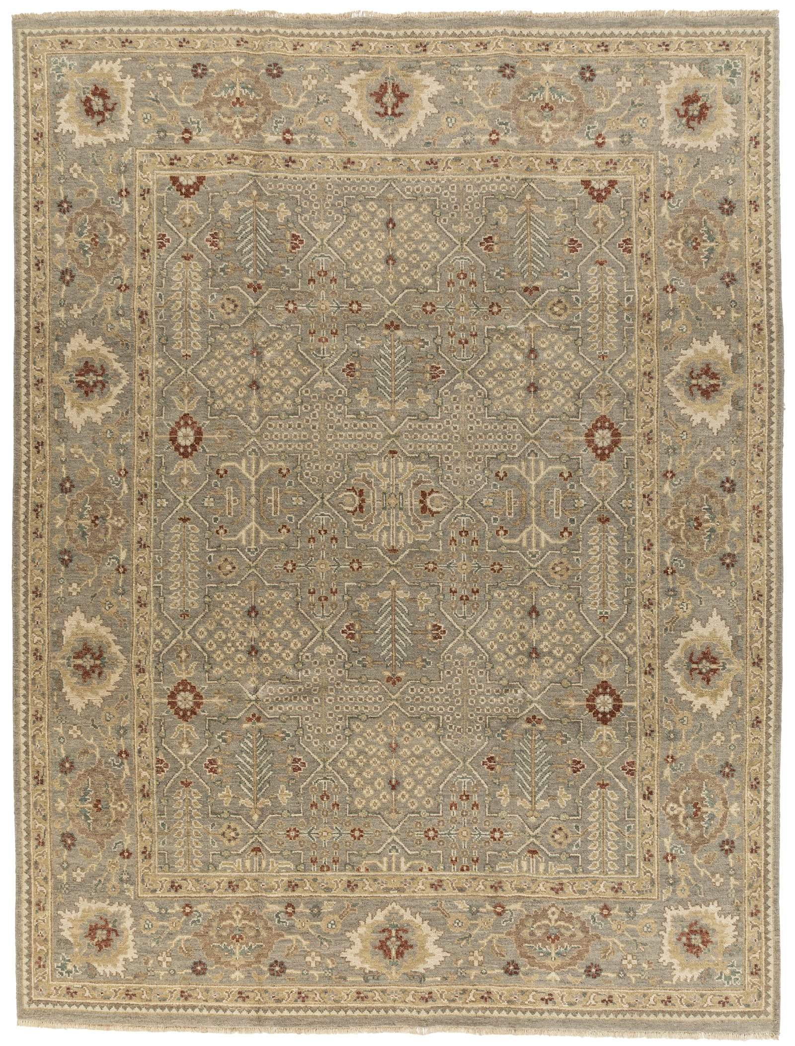 This Indo Heriz design was hand knotted in India of 100% wool and has a grey field with golden tan, cocoa, beige, burgundy and taupe accents. The design would be well suited for home office, bedroom, or living room. Originally produced in just the 4x6 and 8x10 sizes, ask your salesperson if it may be special ordered in other sizes with a five month ETA.
