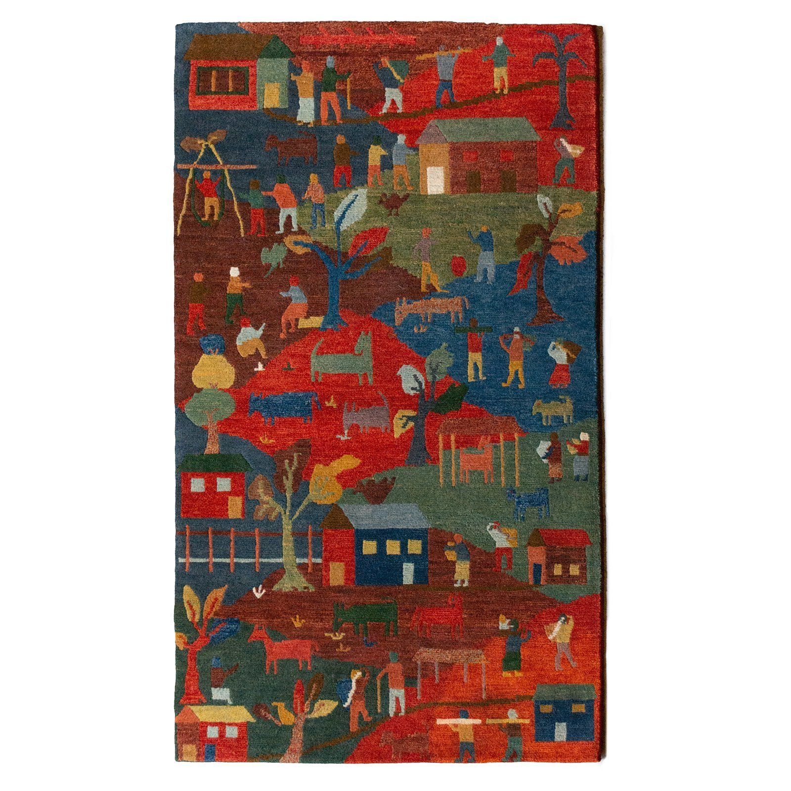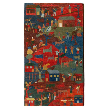 This piece depicts scenes from the life of the weavers in our Nepalese production facilities. It was hand knotted using 100% Himalayan wool.