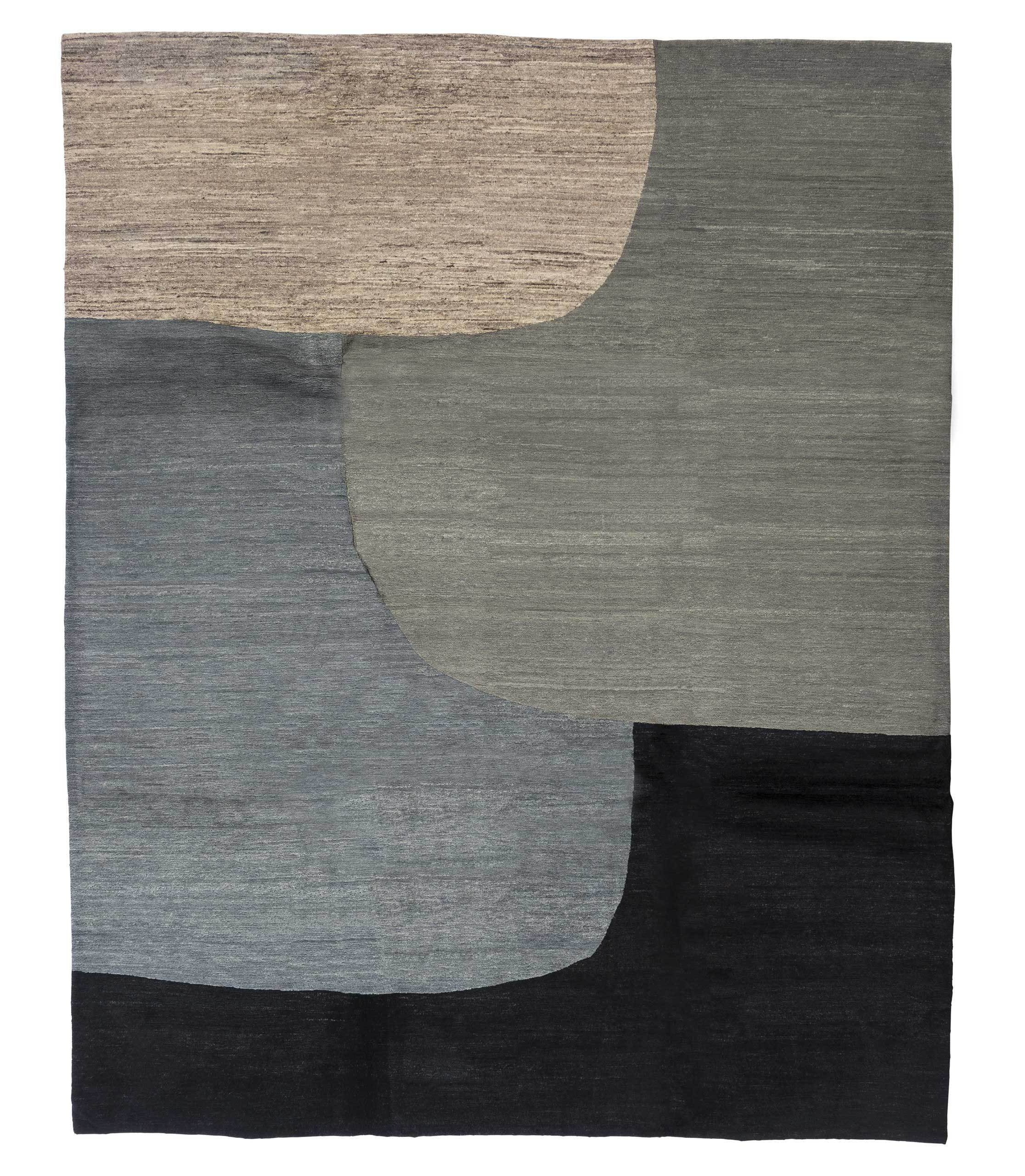 Igloo Black Pool is hand knotted using Himalayan wool. Unbleached wool gives the color fields and a subtle difference in colors because the different colored wools absorb dye differently.