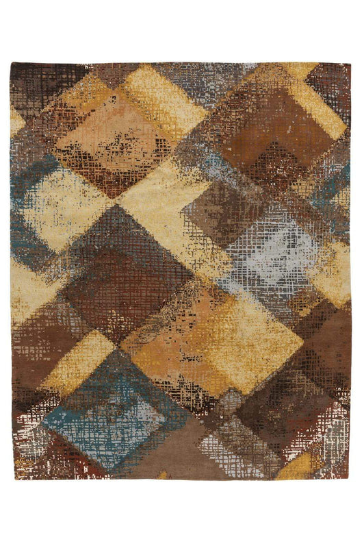 This Barbara Barry one of a kind has a layered pattern filtered thorugh a screen, made in our Timpa Weave, wool with silk accents. Rich ruddy brown, brown rust, golds, terra cotta, turqoise, steel blue, greys, and off white.