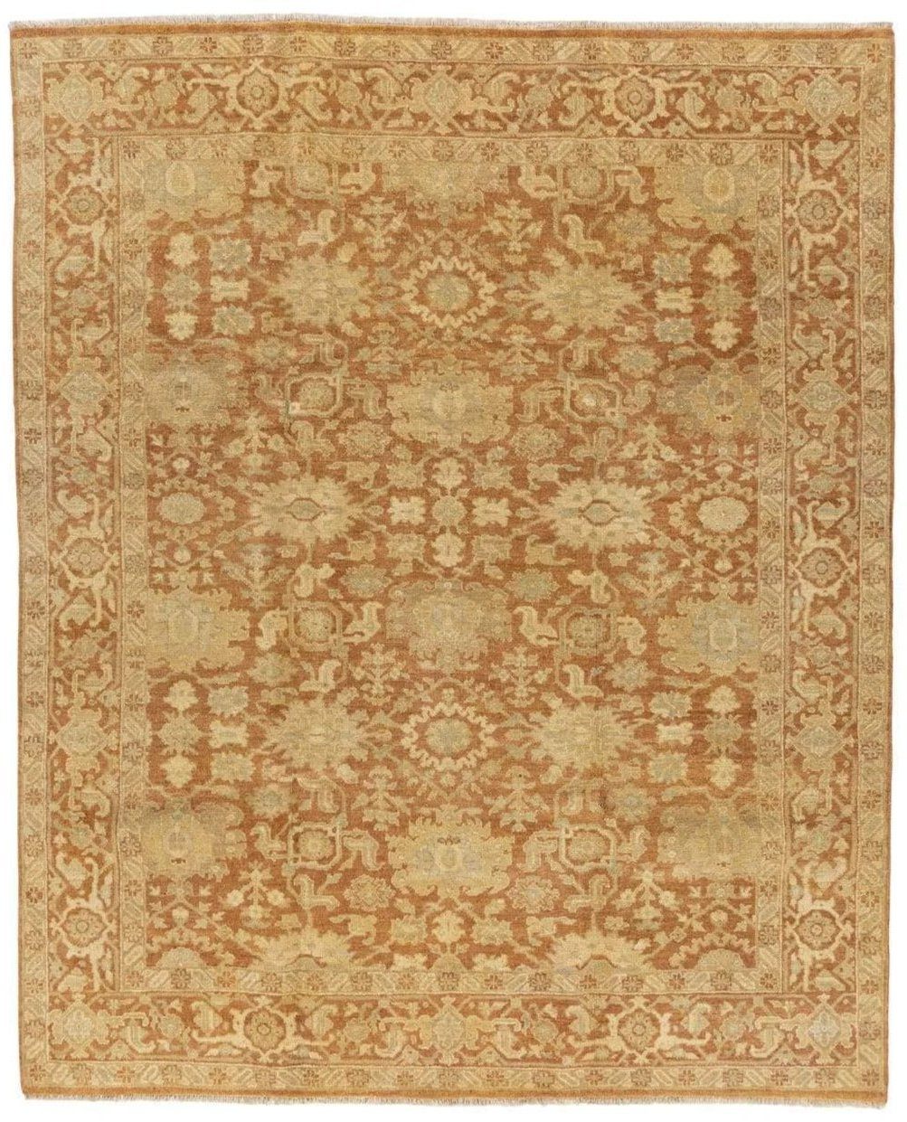Hand knotted in India of 100% wool, this Indo Heriz rug has rust, golden browns, beiges, and light taupe. It would be suitable for an office, living room, or bedroom, or dining room. While this rug was ordered as a one of a kind, please check with your salesperson to find out if it may be custom ordered in other sizesor color combinations.