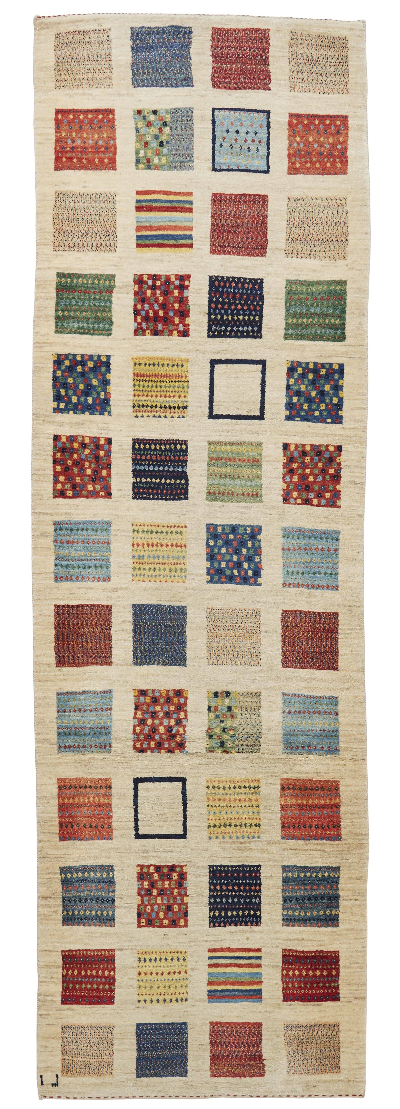 This is a hand knotted KASHKULI rug, made of 100% wool in Iran and measuring 3'1" x 9'11". This vintage gabbeh rug was hand selected for its condition and design, namely a striking transitional pattern in hues of blue, red, beige, and green. This piece was hand selected by James and is available for immediate delivery