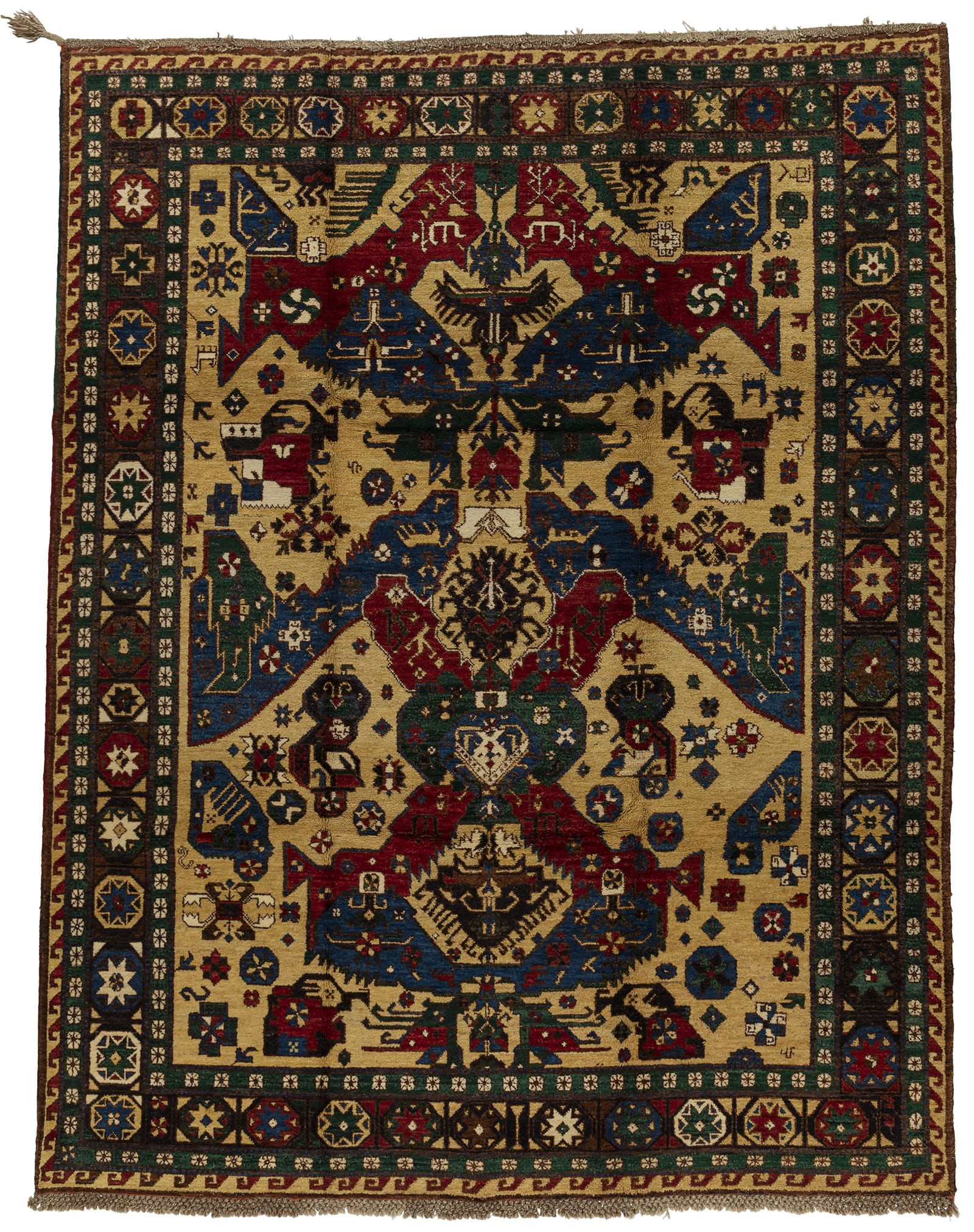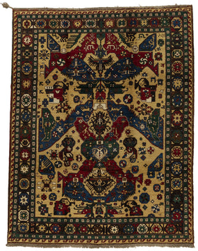 Kazak 8x10 was hand knotted in Armenia of 100% wool using our Kazak weave which has a pile height around a third of an inch. This area rug design is artfully adorned with vibrant tribal motifs in forest green, deep blue, and brick red on a golden beige field and completed with multiple borders.